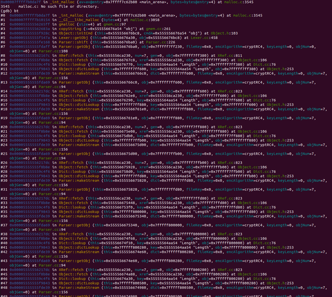 #301 0x00005555555fda69 in Parser::getObj (this=0x555556667cc0, obj=0x7fffff806e00, fileKey=0x0, encAlgorithm=cryptRC4, keyLength=0, objNum=7,