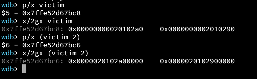 → 스택 주소에 저장된 값들이 heap 주소들(아마도 victim의 fd/fd 등) - p/x (victim-2) → 0x7ffe52d67bc6이고 x/2gx (victim-2)에서도 같은 heap 주소들이 보임(출력 형식만 길게 보이는 것)
