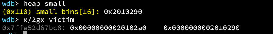 - x/2gx victim 보면 fd/bk 값이 smallbin용 링크로 바뀜.