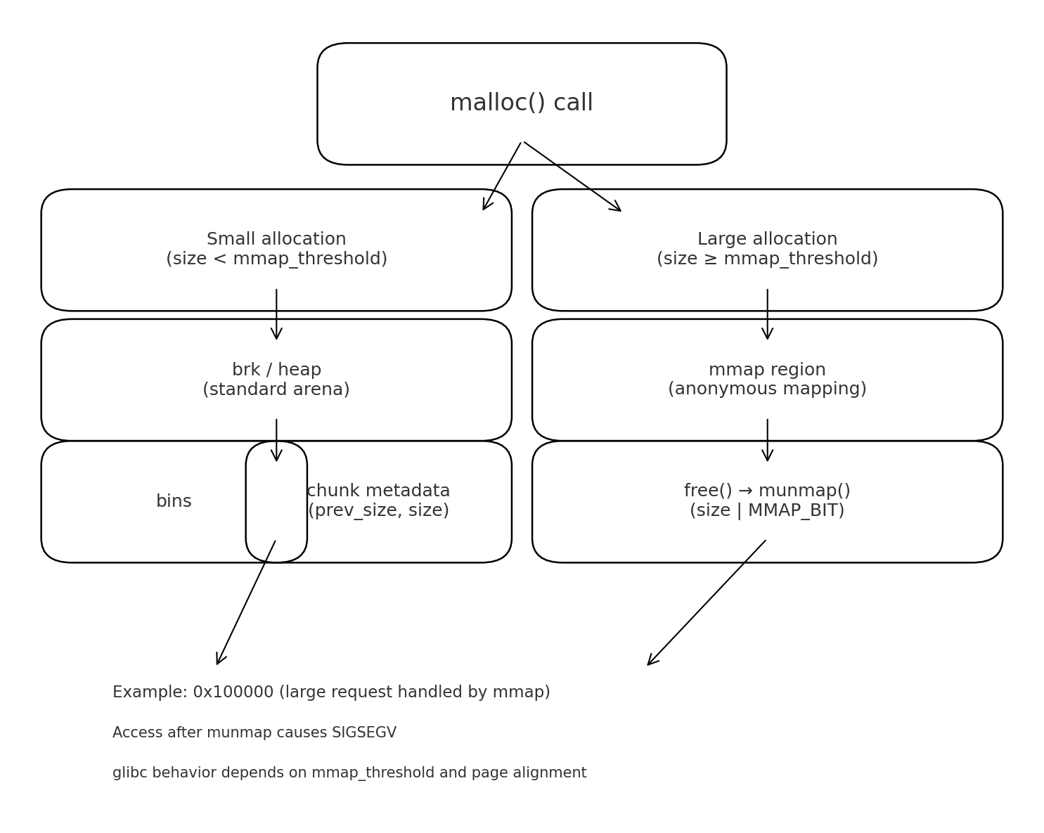 glibc의 malloc은 작은 요청은 일반 힙(브레이크/arenas)에서 처리하고, 매우 큰 요청은 mmap()으로 별도 영역을 받아서 돌려준다.